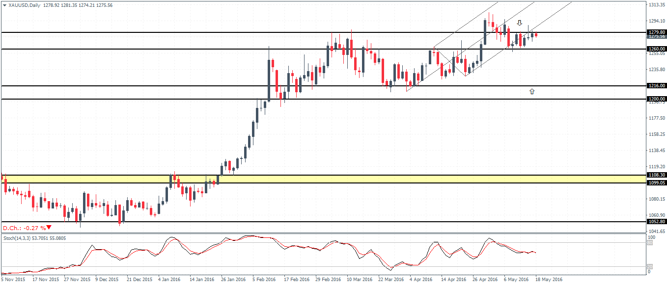 On the daily chart, we notice that after the price was moving in a rising median line, more recently, the breakout from the lower median line saw price action consolidating below 1279 resistance/support level. Although not conclusive, the initial price behavior here shows that gold could be biased to the downside in the near term. As long as the most recent doji high is not breached, gold could push lower to 1260 support.