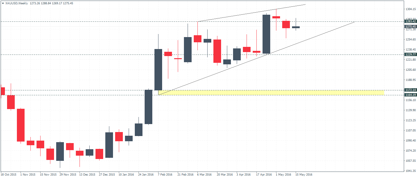 The weekly chart for gold shows prices back near the 1275 – 1284 level of resistance. Prices rallied back to this level despite the doji and the bearish closing last week. Taking a cleaner view of the weekly chart, gold is seen to be consolidating in a rising wedge pattern with 1229 support being a critical level to watch for. A weekly break below this level could see the declines accelerate strongly given the crowded long positions at the recent highs.