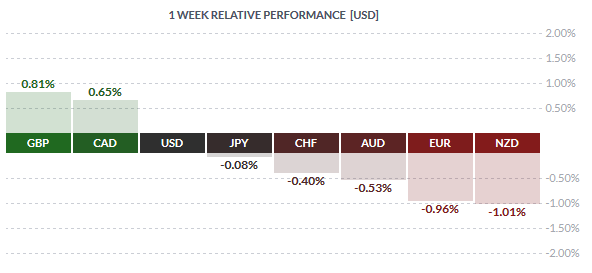 The NZD and the EUR were the weakest currencies last week, including the AUD. The commodity-linked currencies posted steady declines as gold prices continued to fall for the fourth consecutive week. For the euro, despite an upbeat German GDP data, monetary policy divergence was back pushing the single currency lower.