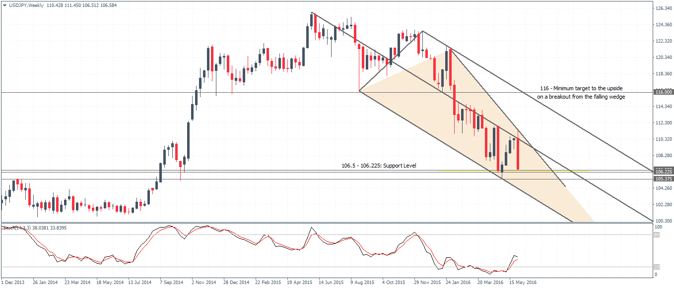 The weekly chart on USDJPY (106.58) shows prices moving in a very steep descending/falling wedge pattern and it is likely that a possible breakout, provided the 106.50 – 106.225 support holds could see strong gains towards 116 levels, which could possibly infer a stronger US dollar and a weaker yen. While it is hard to expect what the central banks will decide, USDJPY’s price action clearly is at a key level, that is worth keeping an eye on.