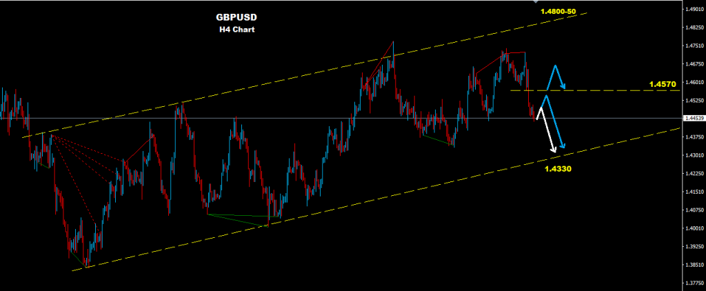 market fell below 1.4570 where we advised yesterday that below this level market may start downtrend wave that may target 1.4330 zone