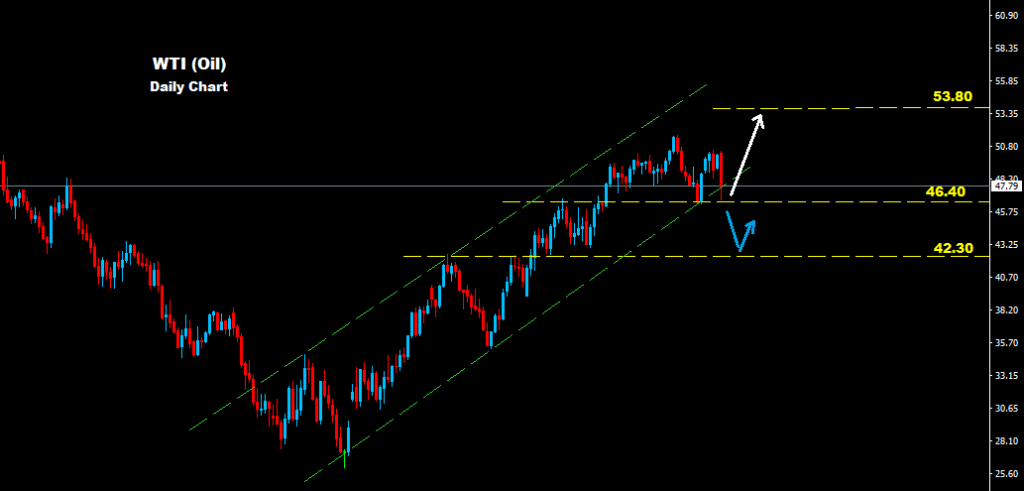 طالما السوق مستمر بالتداول فوق مستويات 46.40 فان منطقة تداول قد تضرب السوق بين مستويات الدعم تلك ومستويات 53.80