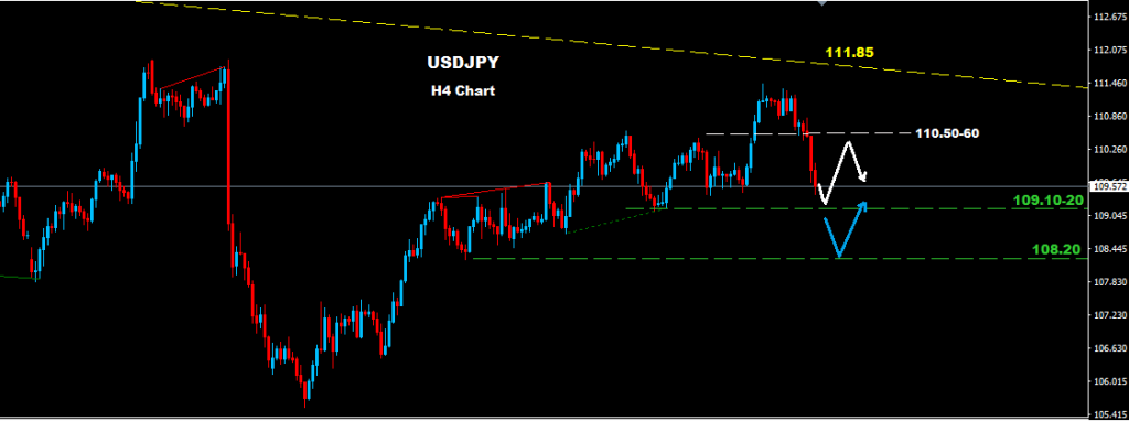 تحت اسعار 109.10 فان السوق قد يستمر بالهبوط حيث يواجه مستويات دعم على اسعار 30-108.20