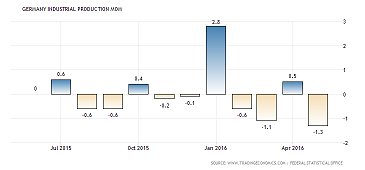 The ministry’s statement said “Industrial production was weak in the middle of the second quarter” noting that several long weekends and bad weather might have played a role on the data. The ministry was, however, optimistic, stating that “after weaker progress in the second quarter, industrial production should resume its moderate upwards trend.” The weak industrial production number follows yesterday’s factory orders which stagnated in May. Germany’s economy got off on a strong footing this year, but many question the sustainability in light of Britain’s decision to leave the EU and broad weakness in the emerging markets which could weigh on German exports.