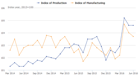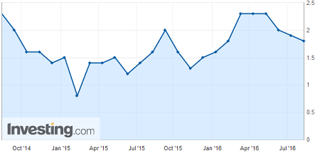 On a quarterly basis, industrial output increased 2.10%, marking the fastest rate of increase in April to June quarter. Samuel Tombs from Pantheon Macroeconomics said that the quarterly increase in industrial output “mainly reflected the 2.3% month-to-month jump in production in April.” The British pound was trading weaker today despite the data. Lee Hopley from EEF said, “Clearly, indicators of sentiment post referendum suggest that we’ve hit the high point for manufacturing this year.”