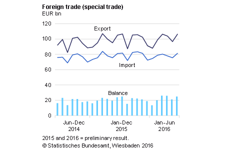 In June 2016, Germany exported goods to the value of 62.7 billion euros to the Member States of the European Union (EU), while it imported goods to the value of 55.2 billion euros from those countries. Germany’s trade surplus jumped higher, to 24.9 billion euro in June, compared to May’s 23.9 billion a year ago. June’s trade surplus was higher than the forecast of 23 billion.