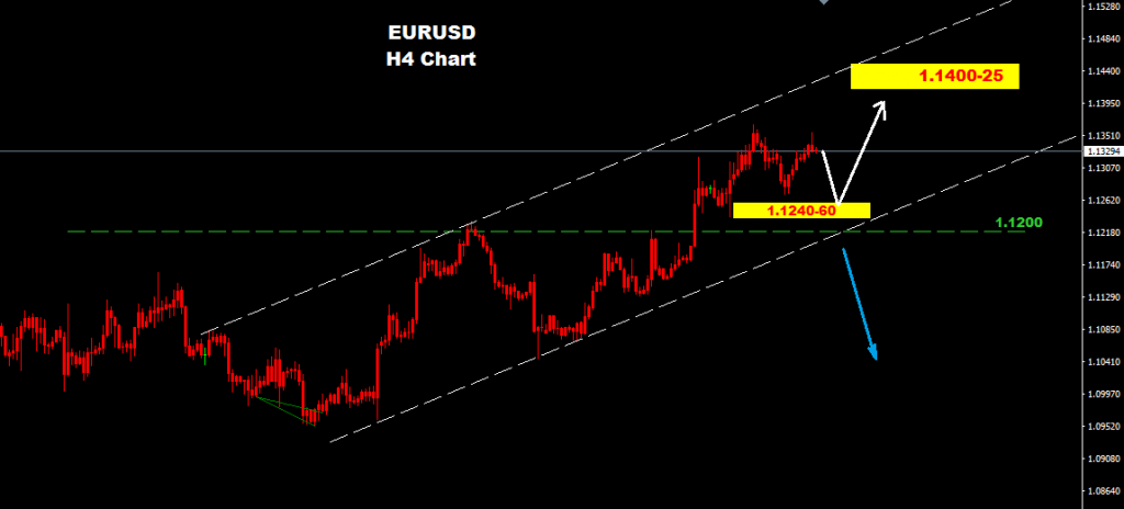 আমারা এখন পর্যন্ত অনুমান করছি মার্কেট ১.১২৪০-৬০ এর থেকে বেড়ে ১.১৪০০-২৫ এর দিকে হিত করতে পারে।