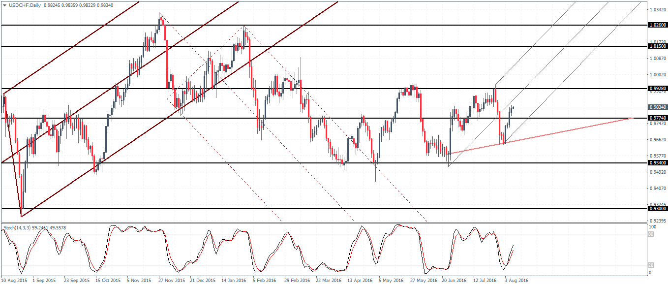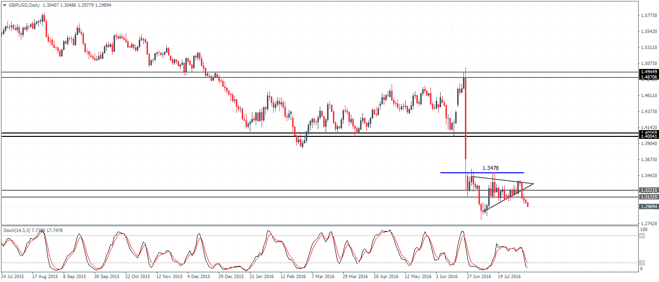 GBPUSD (1.2989) turned weaker after the BoE’s easing policies. However, the declines have been limited in nature with the price still seen trading above the previous lows formed near 1.28. Price action in GBPUSD shows the bearish pennant pattern currently with price breaking down below 1.312 indicating that further declines could see GBPUSD test the previous lows near 1.28. A break below 1.28 could extend the declines further with GBPUSD likely to resume its bearish trend thereafter. However, the Stochastics are showing a higher low which could signal a potential bullish divergence. Watch for any retracements to 1.312 off the 1.28 lows.