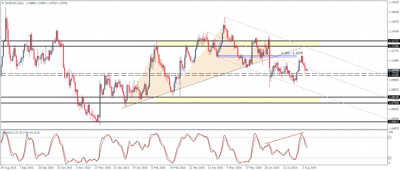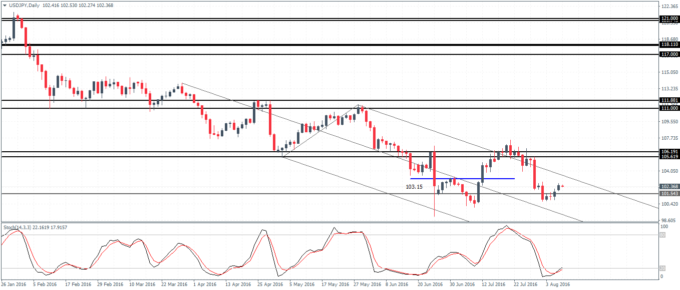EURUSD (1.1079) has been trading flat since mid-June with price seen bouncing off the 1.10 support and 1.120 resistance. Last week’s retest to 1.123 – 1.1214 marks a correction to the declines with prices re-establishing resistance near 1.123 – 1.1214 which previously served as support. A breakdown below 1.105 – 1.10285 is required for EURUSD to continue its declines to the downside. Support near 1.0810 – 1.075 remains the next likely target on a confirmed breakout.