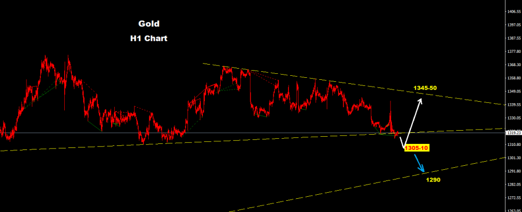 গোল্ড ১৩১৭ এর নিচে হিট করেছে যা কিনা সংকেত দিচ্ছে পরবর্তীতে মার্কেট ১৩০৫-১০ এর দিকে টেস্ট করে আসতে পারে।