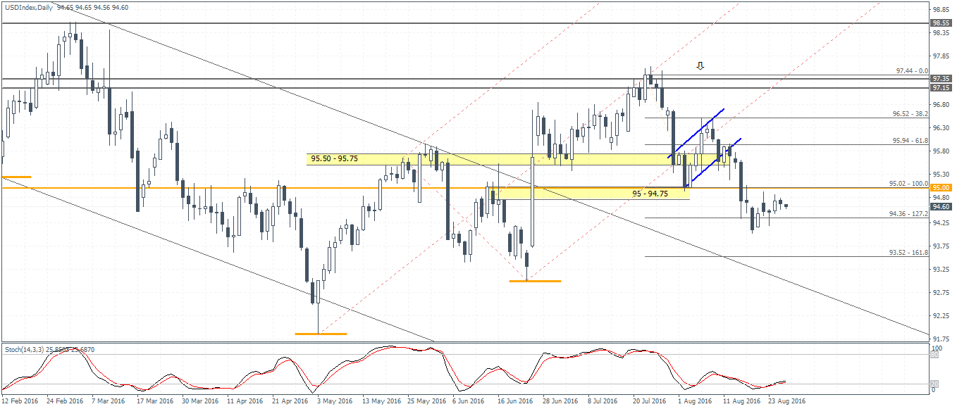 The US dollar index which fell to a one-month low last week, following the bearish flag pattern breakout on August 16, has seen the momentum fading. Prices have since then managed to bounce to the upside following the inside bar setup that was formed last Friday. However, lack of any significant follow through here could mean that the US dollar could either resume its declines or we could see renewed bullish momentum send the dollar back to the 95.00 handle which now acts as resistance. To the downside, the 161.8% measured move of the bearish flag points to 93.53, which could be tested if the dollar breaks below the currently established low at 94.00 or if 95.00 proves too strong to be broken to the upside.