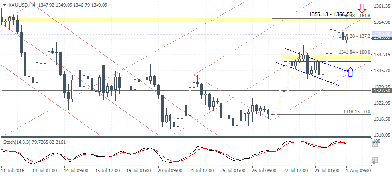 Gold prices have reversed off 1348 – 1350 resistance level after Friday’s last H4 session closed with a doji. The current weakness in price should not be viewed as a longer-term decline as support near 1341.85 – 1340 is strong to hold the declines. Also note the bull flag that has formed, which gives an upside minimum target to 1356 – 1355.