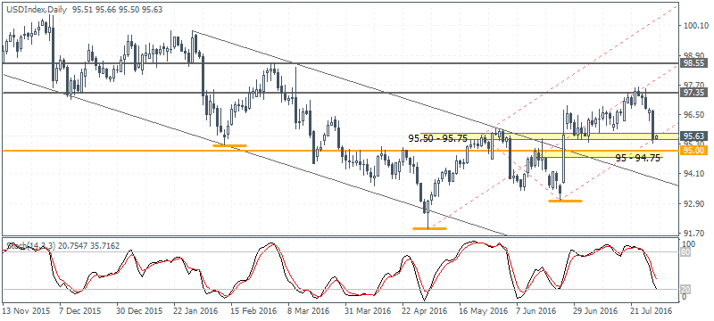 Market Context: The US dollar sold off on Friday as the ICE Futures US dollar index fell to 95.52. The greenback was beaten by the BoJ’s easing which was greatly short of what the markets were expecting and followed by the Q2 GDP print which showed that the US economy expanded at a meager 1.20%, just 0.1 percentage points higher than Q1’s GDP growth.