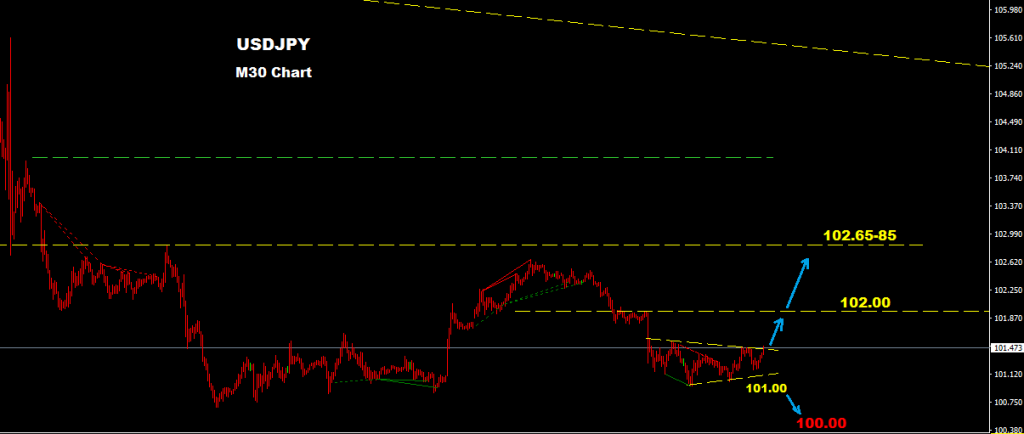 market holding trades inside small triangle formation where as long as market holding above 101.00 a rebound correction may hit market toward 102.00-05 while above this level expect farther advance toward 102.65-85