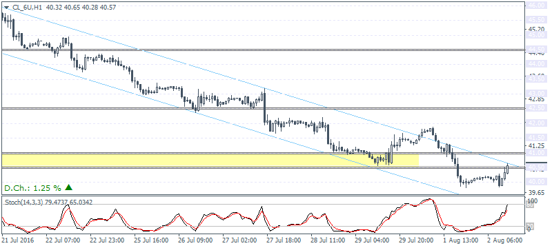 WTI Crude Oil futures contract for September delivery (CL_6U) is currently up 1.25% on the day, trading at $40.57 a barrel.