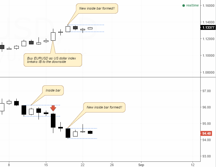 - أحد أفضل الاعدادات تأتي من خلال النظر في أنماط الشموع. على سبيل المثال، إذا كنت ترى شريط داخل أوعامود صعودي / هبوطي على الرسم البياني لمؤشر الدولار الأمريكي، ولكن النمط غير واضح على اليورو مقابل الدولار الأميركي، يمكنك الاستفادة من هذه المعلومات لتداول اليورو مقابل الدولار الأميركي وفقا لذلك (يرجى الرجوع إلى الرسم البياني أدناه)