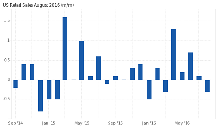 Economic data dump today saw a slew of economic releases. US retail sales fell more than expected at a rate of 0.30% missing forecasts of a 0.10% increase. July’s retail sales were revised slightly higher to 0.10%, making August retail sales the first monthly decline since March. Retail sales excluding autos fell 0.10% on the month in August, missing forecasts of 0.20% and follows July’s revised 0.40%.