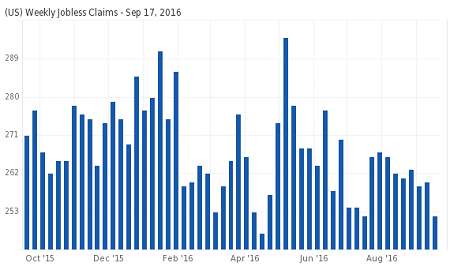 Initial jobless claims data for the previous week of September 10 was unchanged at 260k while the 4-week moving average for the claims fell to 258k. The weekly jobless claims are now into the 81st week of coming out below 300k, marking the longest streak since 1970.