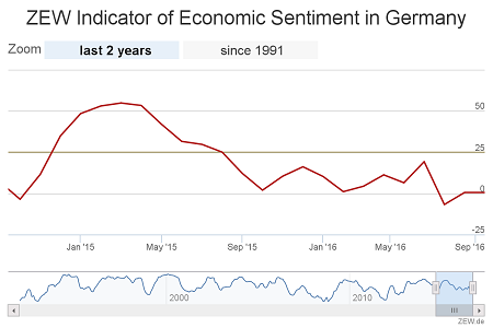 The economic development in the eurozone was slightly higher than expected, rising 0.8 points to show 5.4 in September. The assessment indicator for the current situation fell 0.2 points to -10.5 points.