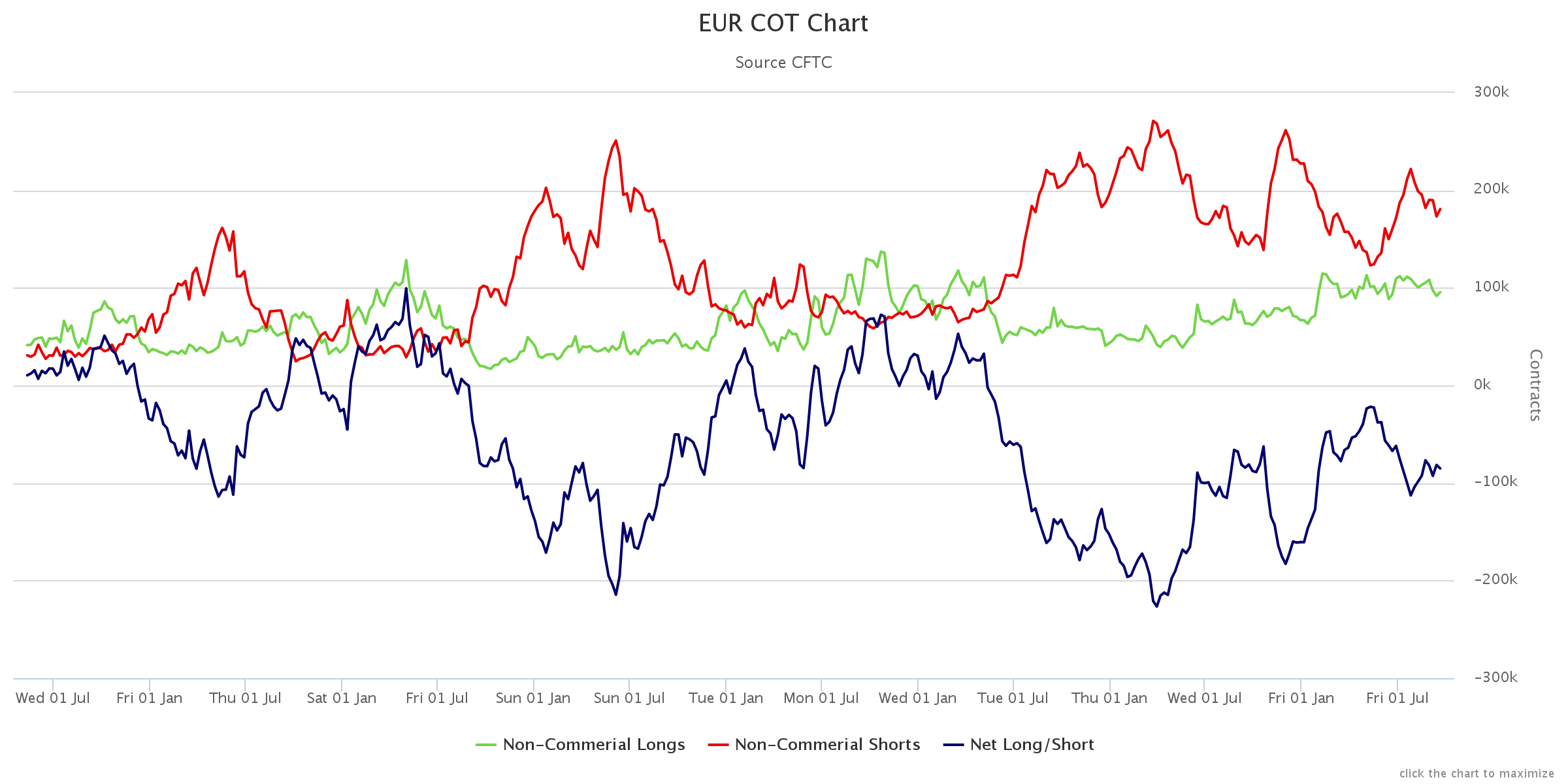 The latest COT report showed that short positions had decreased notably, while long positions have increased very slightly, remaining within a tight range since January of this year. However, net positions remain negative, which means that short sellers remain in control. This keeps the long term bearish outlook unchanged for the time being, and it is of course, due to the ECB’s easy policy (QE).