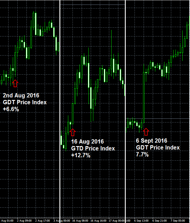 - Negative Reading: this means that demand is declining, leading to lower dairy export and trade balance. In return, NZD would get weaker.