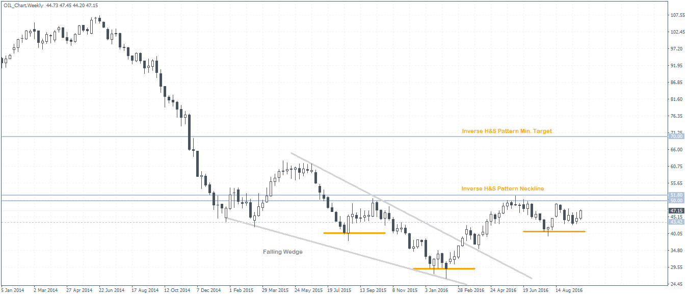 The weekly chart for WTI crude oil currently shows a bullish candlestick. A weekly bullish close could confirm the view that oil prices could see further upside in the near term with the declines limited to $43.40. The weekly chart’s evolving head and shoulders pattern points to the next big technical resistance at $51.80 – $50.00 which will be a critical level that oil prices need to break out from. Only a convincing breakout above $50 can ascertain further bullish views towards the measured target of $70.00