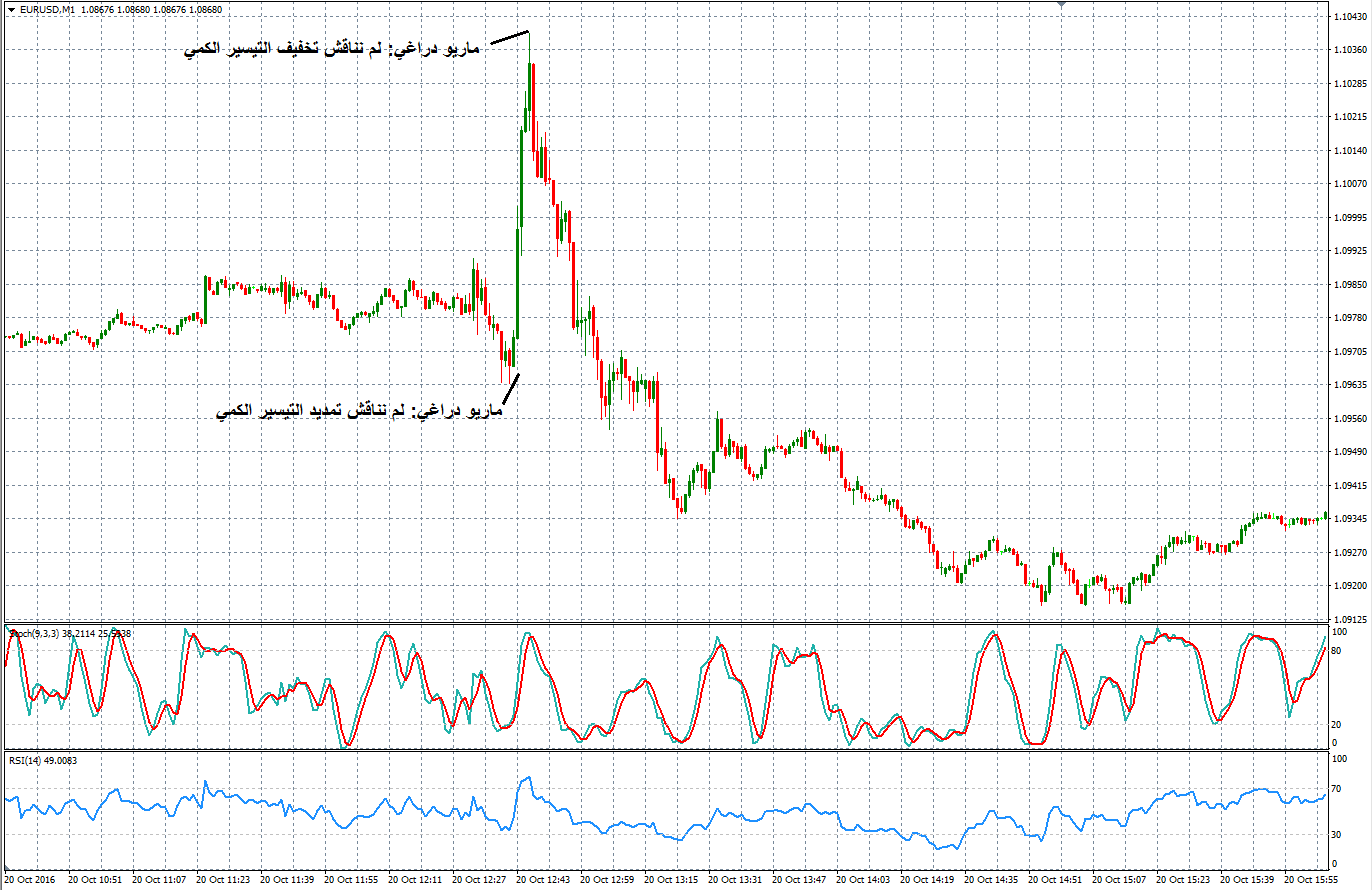 عندما قال رئيس البنك المركزي الاوروبي ماريو دراغي بأنه لم يتم مناقشة تمديد التيسير الكمي في هذا الاجتماع, فهمت الاسواق من هذا التعليق بأن البنك المركزي الاوروبي سيعلن عن اجراءات تخفيف التيسير الكمي قريباً, وهو ما يعتبر ايجابي لليورو مقابل الدولار والعملات, وهو ما ادى الى ارتفاع اليورو الى ما فوق مستويات 1.1020. على الرغم من ذلك, وعندما ذكر ماريو دراغي انه لم يتم مناقشة تخفيف التيسير الكمي في هذا الاجتماع, اصبح المتداولون في حال من الحيرة, وهو ما رفع توقعات الاسواق حول اضافة المزيد من التيسير الكمي او تمديد البرنامج الحالي. وعليه, عاد اليورو الى الانخفاض من جديد الى ادنى مستويات الجلسة.