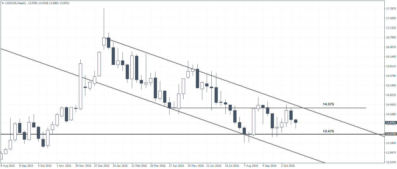 USDZAR is set to close a second week with gains although price action on the weekly chart shows an inside bar formed last week, indicating a near term break out from the range. Price action in USDZAR has been limited to a sideways pattern with 14.375 and 13.475 playing the resistance and support levels within the falling price channel.
