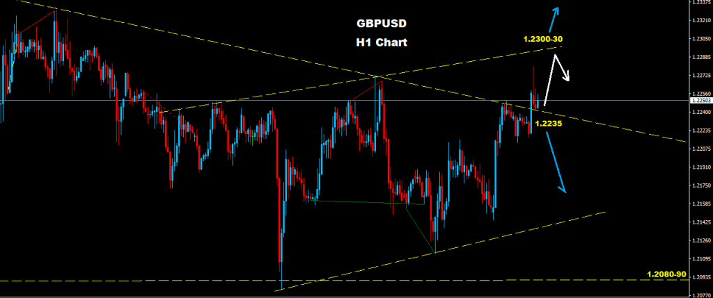 মার্কেট ১.২২৩৫ এর নিচে চলে গেলে তা আরও কমে গিয়ে ১.২১৪০-৫০ জোন এর ভেতরে অবস্থান করতে পারে যেখানে আরেকটি সাপোর্ট ১.২২০০ তে হতে পারে।