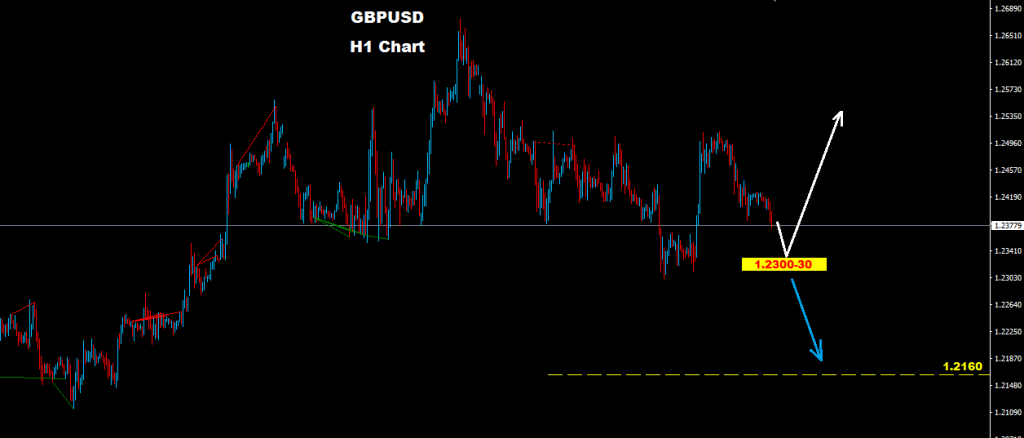 মার্কেট ১.২৩০০ এর নিচে চলে গেলে তা ড্রপ করে পরবর্তীতে ১.২২৪০ এবং ১.২১৬০ জোন এ টার্গেট করতে পারে।