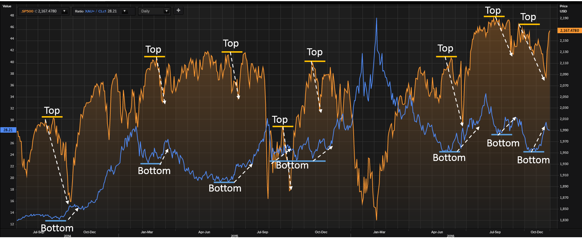 Once you export the data, you need to divide the daily closing price of gold by the daily close price of Oil. Once you do this, you will get the ratio. Then, you can create a chart just like the one above. Yet, finding a live chart would be even better to monitor the price change on a daily basis, especially where there is a significant move in either Gold, Oil and even US stocks.