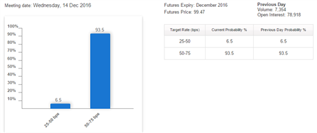 Following the release of the FOMC meeting minutes, the 30-day Fed funds futures markets is assigning a 93.5% probability for a 25 basis point rate hike when the Fed meets on December 13 – 14.