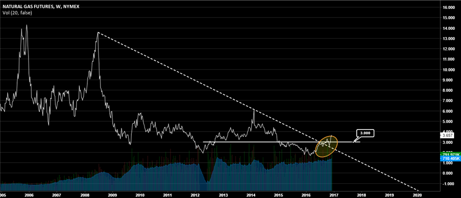 Natural gas futures have been on a medium-term bullish rally since early 2016 after the price fell to a 17-year low of 1.639 in February this year.