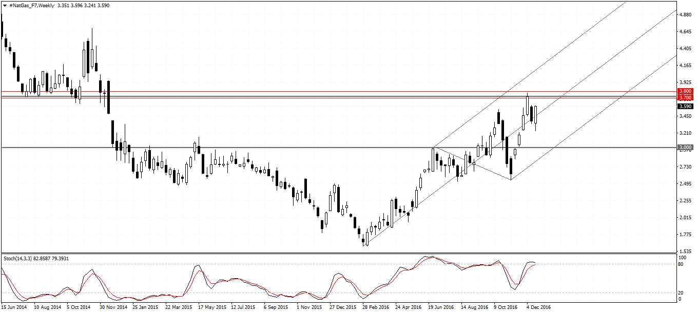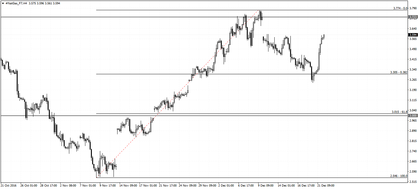 Natural gas futures which rallied to a fresh 2-year high three weeks ago started to correct lower after briefly trading above $3.70 mmBtu. The correction sent Natural gas futures prices towards the 38.2% Fibonacci retracement level near $3.30 this week from the 9th November lows of 2.54 and the $3.77 highs from December 9th. The unfilled gap at $3.72 is the most likely upside target in the near term, with a close above $3.77 likely to signal further continuation to the upside.