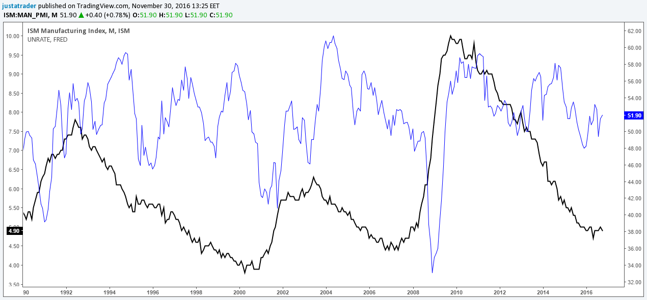 Furthermore, there is no set period within which you can expect a lagging indicator to confirm the changes already predicted by the leading or coincident indicator. The chart below shows an overlay of the ISM manufacturing PMI (blue line) and the US unemployment rate (black line). On close observation, you can see how the unemployment rate lags the changes in the ISM manufacturing PMI. There are times when the reaction from the lagging indicator is often swift in response, and at times there is a significant lag.
