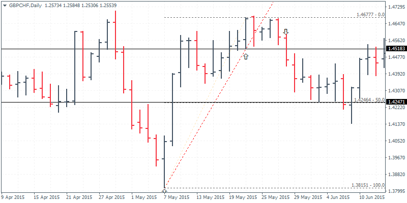 In the above chart we have plotted two horizontal lines; one marking the 50% retracement level of the down leg, and the second horizontal line marking the lower high on the trend line. The next step is to wait for a daily bar to close above the lower high and then place a pending long order, targeting the 50% level. For stops, you can use either the low of the down leg or place the stops a few pips below the low of the second lower high bar that is used. A second position is opened at market at the start of the new daily bar but having the same stop loss and take profit levels.