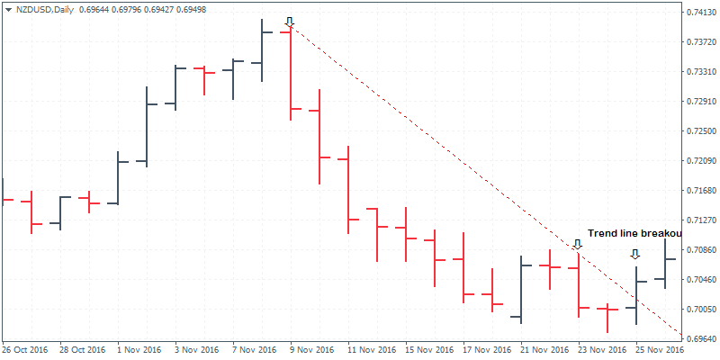 The first thing to pay attention to here is the way the trend line is plotted. The specific lows have been selected such as the breakout of the trend line occurred with a bearish bar. This is extremely crucial and important to the success of this strategy.