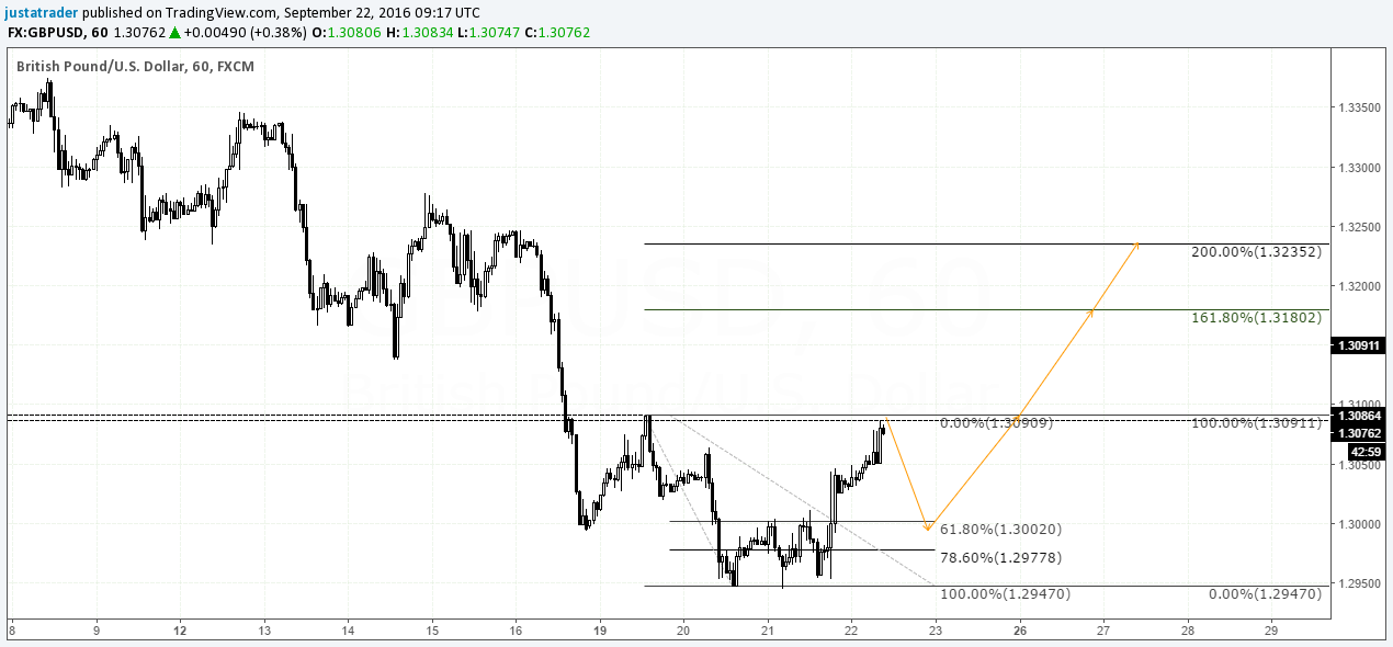 In this example, we have a pattern that is still evolving. We can see the neckline resistance formed with the left shoulder and the head formed. Currently, we wait for the price to fall towards the 61.8% – 78.6% reversal zone (1.3002 – 1.2977) for long positions with targets set to 1.3901, 1.3180 and 1.3235 with stops at 1.2947.