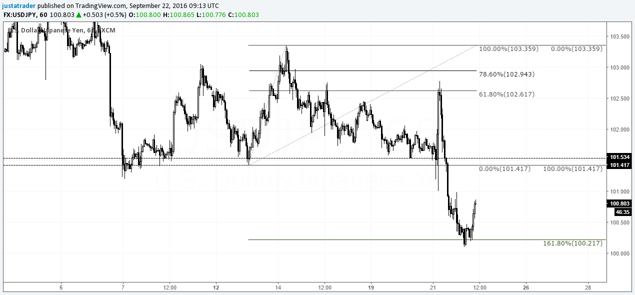 The second example above shows a smaller version of the head and shoulders pattern. Here the trick is in catching the retracement that formed the right shoulder rather quickly. Price action has been choppy at the 618% – 78.6% reversal level.