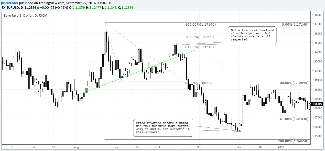 This is a missed opportunity, but it shows that the pattern can at times continue to respect the head and shoulders measured move approach without having to meet the guidelines. A trader should exhibit discipline to take the trades that only fulfill the criteria.