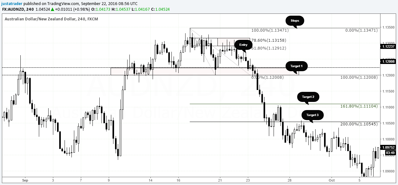 The next example here shows a head and shoulders pattern that is not quite a neat head and shoulders pattern. At the right shoulder, the reversal is missed as price falls short of rallying to the 61.8% – 78.6% Fibonacci level. Still, despite the breakout from the neckline, price rallies back to the reversal zone before pushing lower. This pattern is a bit tricky to trade, but illustrates how price action can at time respect the structure and the rules. Another interesting bit about this example is the price reversal near 161.8% without reaching the final target.