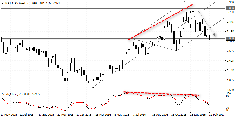 It is quite possible that Natural gas futures could remain range bound at the current levels well into late February where there is a strong possibility that a new higher low could be formed, keeping in trend with the seasonality. A reversal off the $3.00 handle coinciding with the timing could see prices potentially rising on a steady pace in the coming weeks. However, there is some chance that natural gas prices will continue to decline especially if the support level at $3.00 is breached on a weekly basis. In this instance, natural gas prices are likely to slip towards $2.650, which see a retest of the breakout from the long term rising pitchfork.