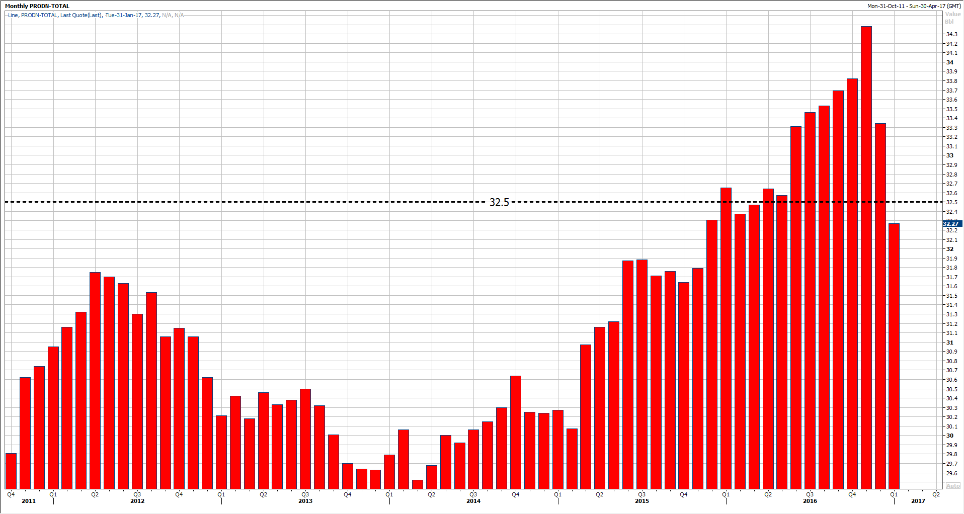 Moreover, the numbers showed that December production decreased all the way back to 33.3 Million barrels. So in total, this is the second monthly decline in a row, one we have not seen since 2013.