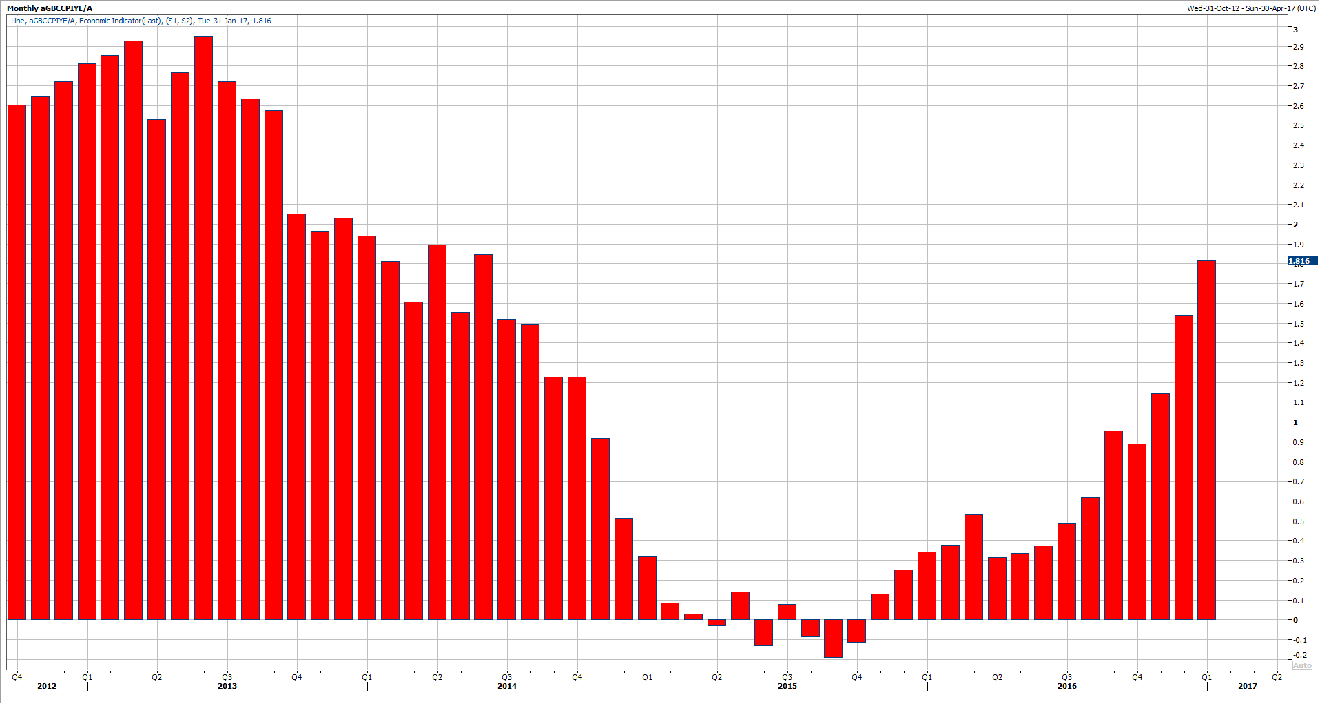 The CPI YoY edged higher to 1.8%in January, posting the third monthly increase in a row and the highest reading since June of 2014.