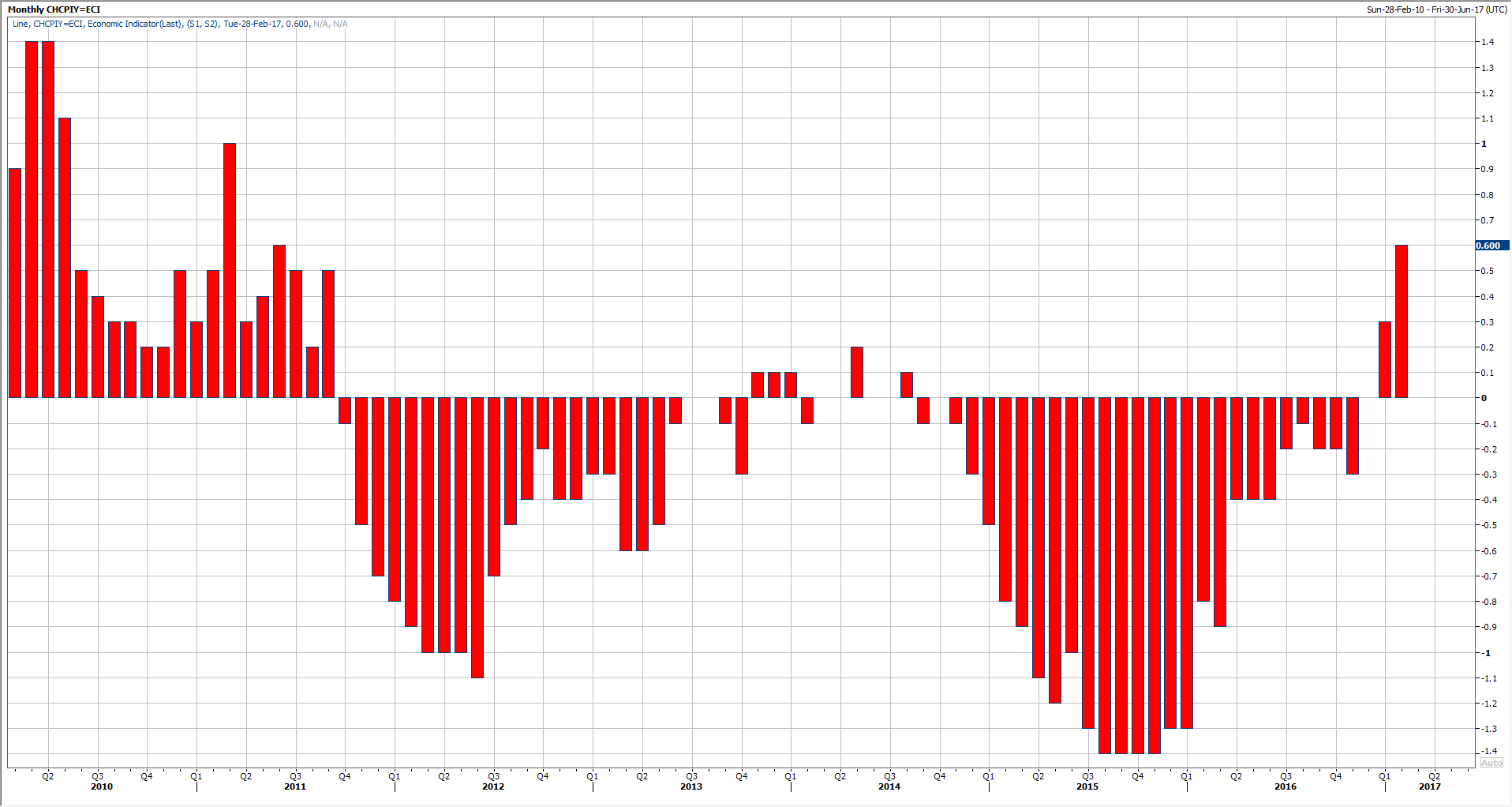 Today’s YoY CPI edged higher to the highest level since 2011, rising to 0.6% in February compared to 0.3% in January of this year. This is the first time Switzerland YoY posts two consecutive positive reading since 2013.