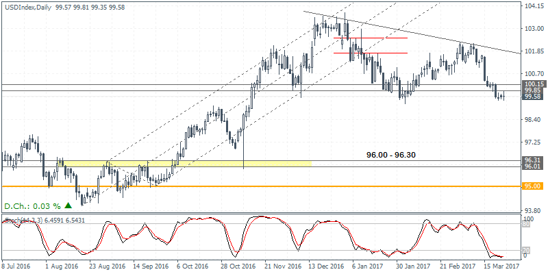 Last week, the U.S. dollar fell below the psychological round number level of 100.00 as investors pared bets on the so-called “Trump Trade,” where President Trump is yet to make good on his election promises.