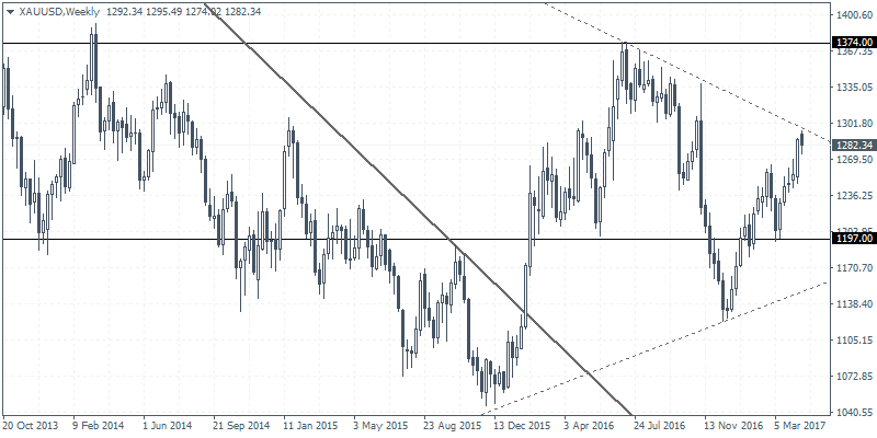 A Le Pen victory in the second round will no doubt put traders on the edge which could be a positive for gold. Gold prices rallied to a high of 1295.49 this week but failed to test the 1300.00 key price level and instead pulled back lower.