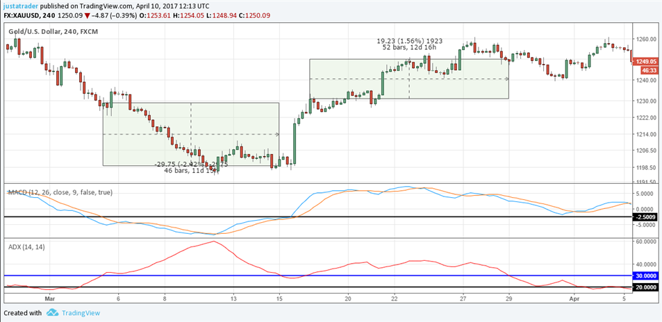 Here, a long position is taken on the uptrend and this trade would have kept the trade running for a $19.23 move in gold.