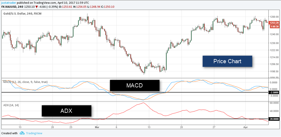 The ADX is used as a trend detection indicator, but it has a major shortcoming. The ADX does not show the direction of the trend, but only the strength of the trend. This is overcome by making use of the MACD which can signal trends as well as sideways price action.