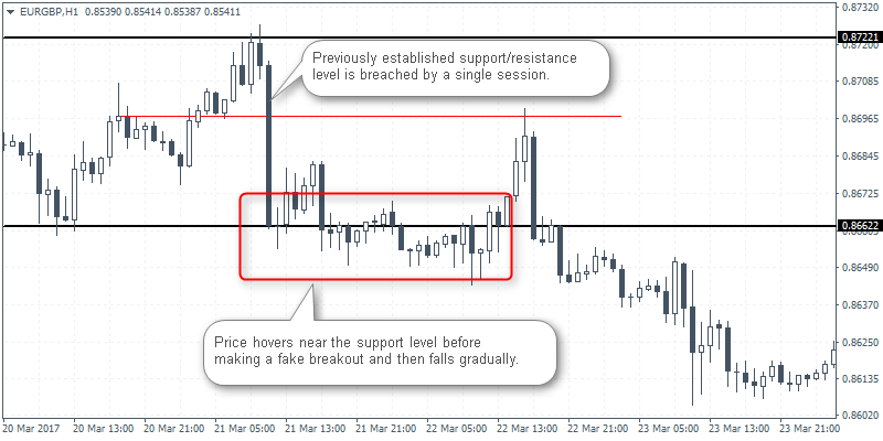 - Price hovers around the support/resistance level, makes a fake breakout and then breaks the support/resistance level